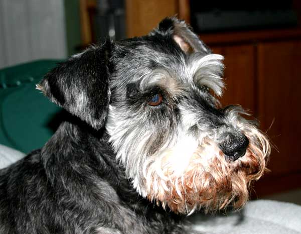 Spike came to us from the Schnauzer Rescue, in April of 1999. He had just turned 8 years old. He was in pretty rough shape, with a good percentage of fur missing from his back, and hurting pretty bad. It was apparent that he had been a victim of abuse along the way. It took him a couple of months of mostly sleeping and healing, before he started trusting us.